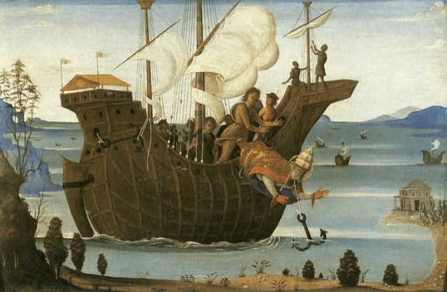 According to apocryphal acta dating to the 4th century at earliest, Clement was banished from Rome to the Chersonesus during the reign of the Emperor Trajan and was set to work in a stone quarry. Finding on his arrival that the prisoners were suffering from lack of water, he knelt down in prayer. Looking up, he saw a lamb on a hill, went to where the lamb had stood and struck the ground with his pickaxe, releasing a gushing stream of clear water. This miracle resulted in the conversion of large numbers of the local pagans and his fellow prisoners to Christianity. As punishment, Saint Clement was martyred by being tied to an anchor and thrown from a boat into the Black Sea. The legend recounts that every year a miraculous ebbing of the sea revealed a divinely built shrine containing his bones. However, the oldest sources on Clement’s life, Eusebius and Jerome, note nothing of his martyrdom. [from wikipedia]